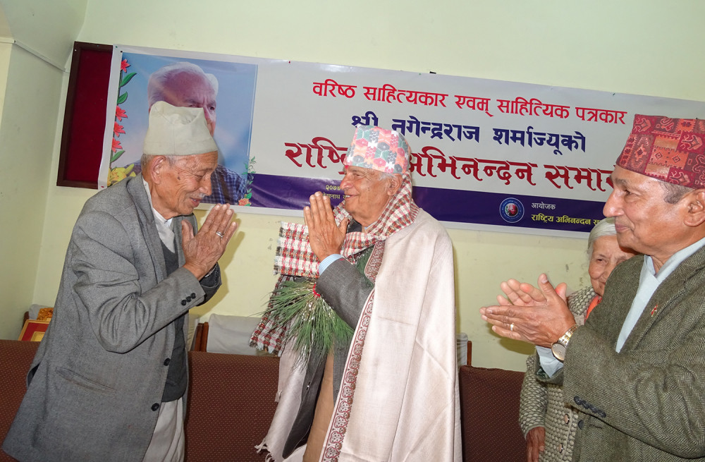 काठमाडौँ — साहित्यकार एवं पत्रकार नगेन्द्रराज शर्मालाई अभिनन्दन गरिएको छ । शर्मा ५१ वर्षदेखि प्रकाशित ‘अभिव्यक्ति’ साहित्यिक द्वैमासिकका संस्थापक प्रधान सम्पादक हुन् । वि.सं.१९९४ चैत २२ गते रामेछापमा जन्मिएका शर्मालाई ८४औं जन्मोत्सवका अवसरमा विभिन्न साहित्यिक संस्थाले आइतबार राजधानीमा अभिनन्दन गरेका हुन् ।