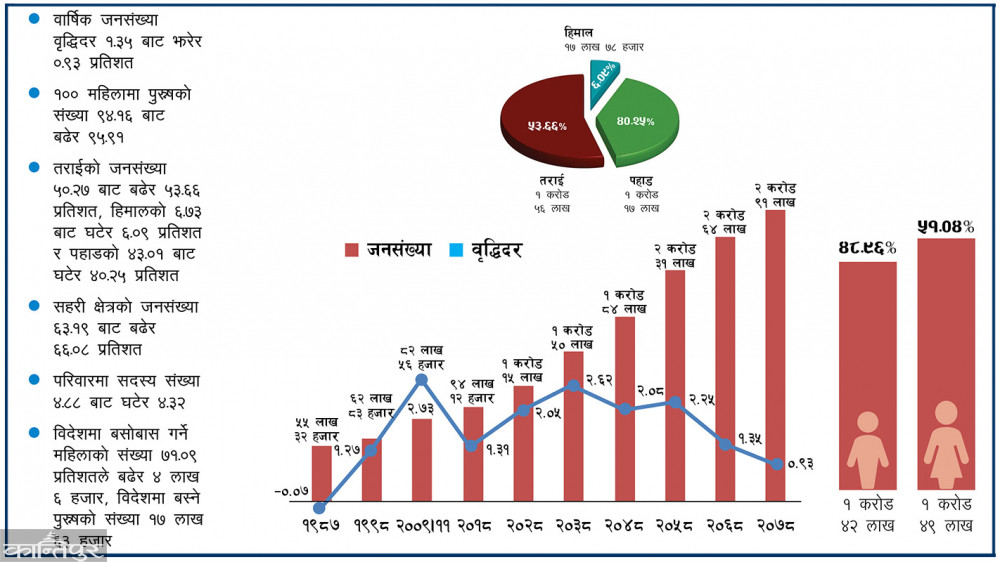 सरकारले नगरपालिकाको संख्या २ सय ९३ पुर्याएसँगै सहरी जनसंख्या पनि स्वतः बढेको विभागले जनाएको छ । तर, यसमा बसाइँसराइको भूमिका पनि मुख्य छ । ४ सय ६० गाउँपालिकालाई ग्रामीण जनसंख्याका रूपमा लिइएको छ । जसअनुसार ३३ दशमलव ९२ प्रतिशत ग्रामीण जनसंख्या रहेको छ । अंकका आधारमा सहरी जनसंख्या १ करोड ९२ लाख ९१ हजार ३१ र ग्रामीण जनसंख्या ९९ लाख १ हजार ४ सय ४९ छ ।
